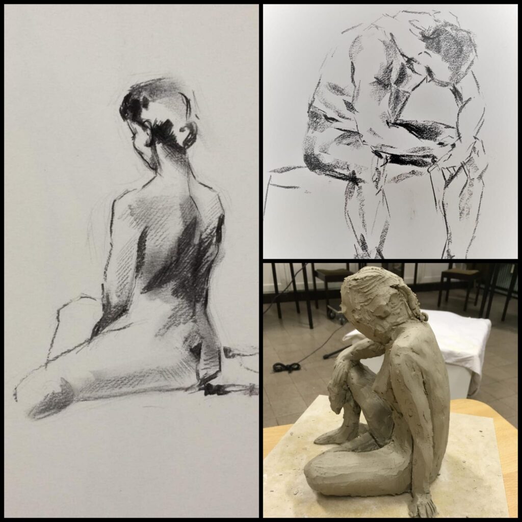 In de cursus werken we naar levend model in een zittende stand en daarna een liggende stand. We beginnen met 1 beeldje per les